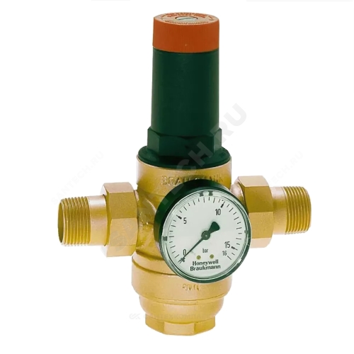 Регулятор давления мембранный латунь D06FH Ду 15 Ру25 G1/2" НР/"американка" Рн=1,5 - 12бар с вых. под маном. Honeywell D06FH-1/2"B